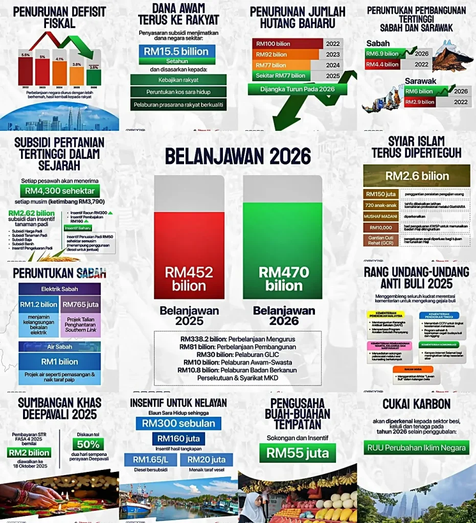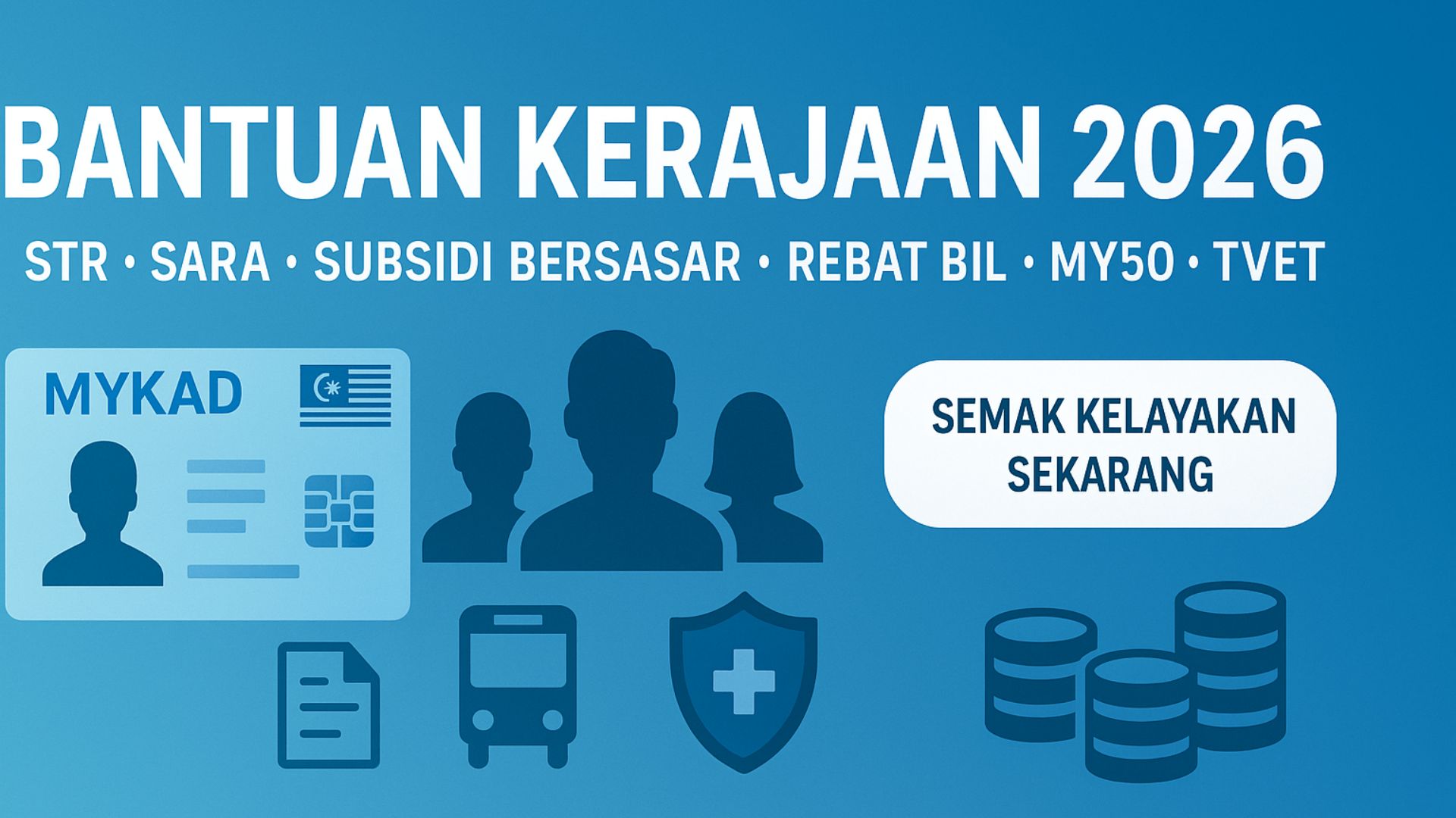 Belanjawan 2026: Semua Jenis Bantuan Kerajaan Yang Rakyat Boleh Manfaatkan (Panduan Lengkap & Mudah Faham) — Artikel rujukan ini menghimpunkan kategori bantuan utama yang lazim diumumkan kerajaan dalam belanjawan tahunan: tunai langsung, barangan asas melalui MyKad, subsidi bersasar, rebat utiliti, skim perlindungan sosial, pengangkutan awam, pendidikan, kesihatan, pekerjaan dan usahawan. Setiap bahagian disusun ringkas, dengan contoh kadar yang biasa digunakan serta tindakan yang perlu anda buat supaya tidak terlepas.