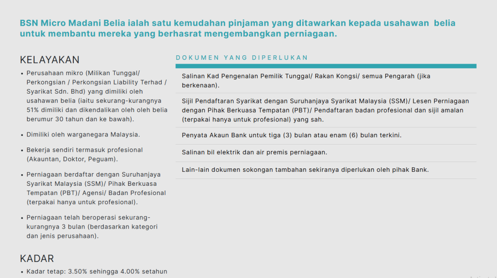 Belia yang berminat memulakan perniagaan kecil boleh memohon Geran MADANI Belia sehingga RM10,000 bagi sektor makanan, perkhidmatan digital dan pertanian bandar. Dana ini diuruskan melalui agensi seperti TEKUN, SME Corp dan MARA.